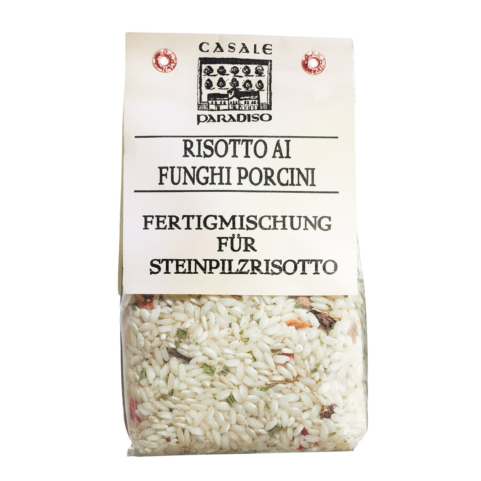 Zutaten: Carnaroli Risottoreis 96 %, Steinpilze (Boletus Edulis) 2,6 %, Karotte, Schnittlauch, Petersilie, Knoblauch