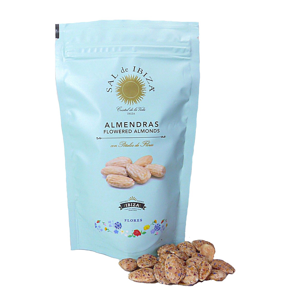 Knabbern mit besten Zutaten. Sal de Ibiza kombiniert die Qualitätsmandeln der Sorte Marcona mit dem eigenen Blütensalz. Die Mandeln werden geröstet und dann mit Salz und einer Blütenmischung aus Rose, Kornblumen und Orange gewürzt.